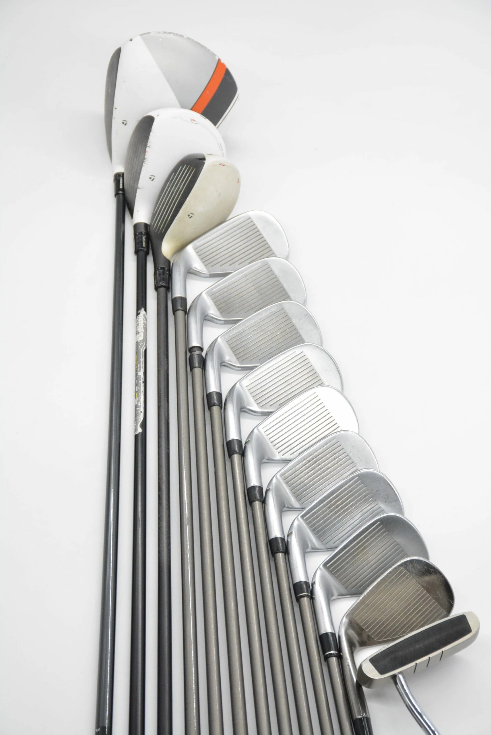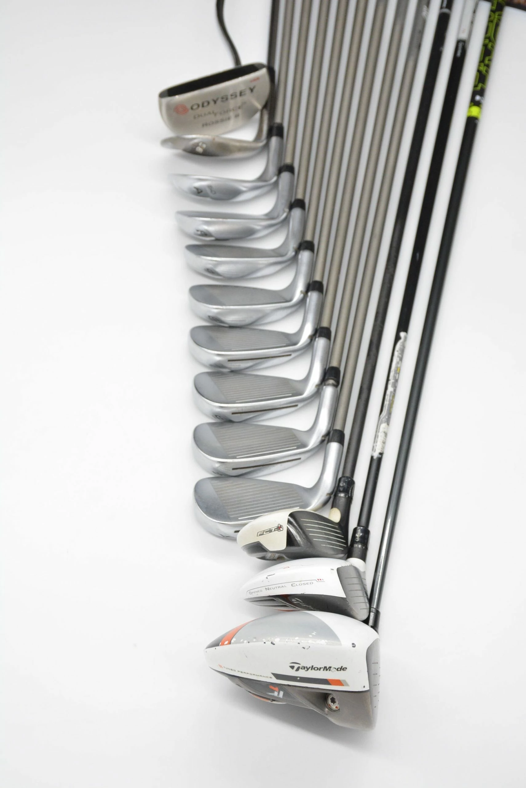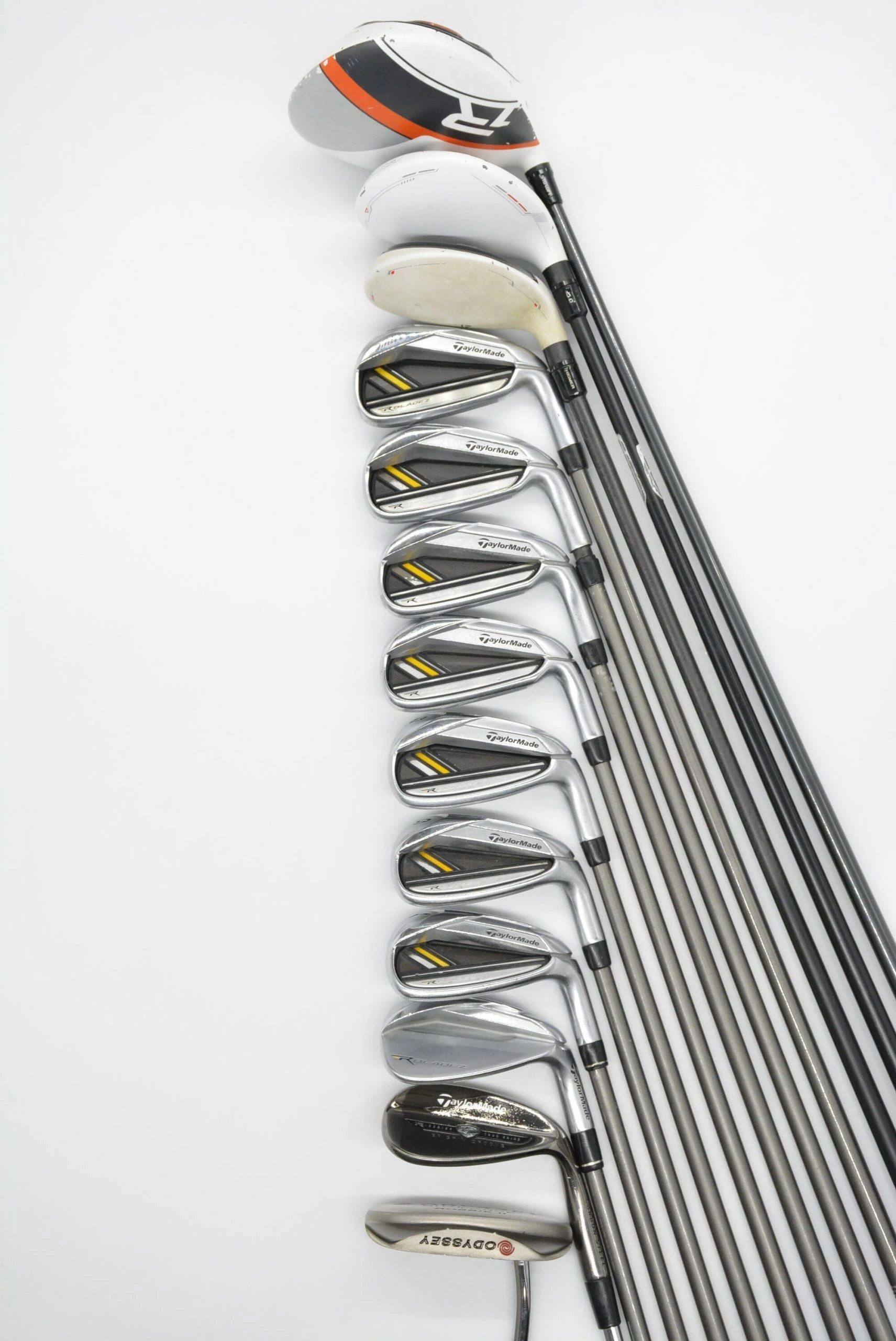 Set includes a TaylorMade R1 Driver, a TaylorMade R11 3 Wood, a TaylorMade Rescue 5 Hybrid, TaylorMade RBladez Irons 4-AW, a TaylorMade R-Series Tour Grind EF Spin Groove 58 degree Wedge, and an Odyssey Dual Force Rossie II 35in. Putter. Irons are in great condition with light wear to the heads and faces, with Aerotech SteelFiber i80 graphite shafts and Golf Pride MCC+4 grips.